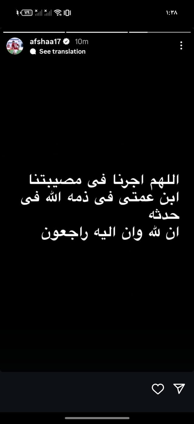 نعى محمد مجدي أفشة لاعب النادي الأهلي، وفاة ابن عمته، عبر حسابه الشخصي على إنستجرام، وكتب أفشة: اللهم أجرنا في مصيبتنا، ابن عمتي في ذمة الله، في حادثه، إنّا لله وإنّا إليه راجعون.